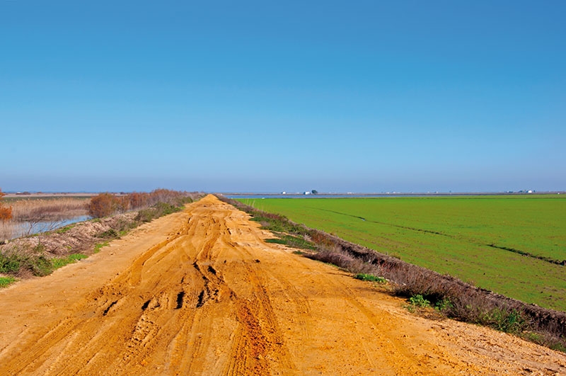 Det stora risfältsområdet runt orten Isla Mayor ligger sydväst om Sevilla. Ta fram en karta och följ floden Río Guadalquivir med fingret så syns strax ett stort, grönt fält. Zooma in kartan om du har den i mobilen, så framträder märkliga detaljer. Ett oändligt antal spikraka blå linjer som delar upp det gröna området i en mängd små rektanglar. De blå linjerna är grävda kanaler, och genom området går lika spikraka bruna streck. Grusvägar. Mycket långa och mycket raka.