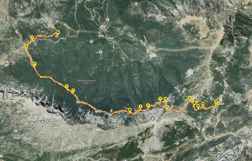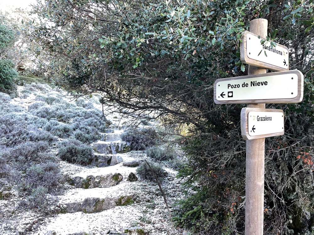 Vandringen tar sin början strax utanför Grazalema, vid de gamla stenbrotten ”Las Canteras” som idag är en rastplats. Här, på omkring 1.100 meters höjd, väntar en stigning som direkt får fart på pulsen. Stigen slingrar sig i snäva serpentiner genom tallskog, och ju högre man kommer desto mer öppnar sig landskapet. Efter knappt en timmes gång når man Puerto de las Cumbres, ett bergspass som känns som en naturlig port in i Sierra del Pinar. Härifrån breder vyerna ut sig mot Grazalemas vita hus nedanför och längre bort mot Ronda och Sierra Nevada.