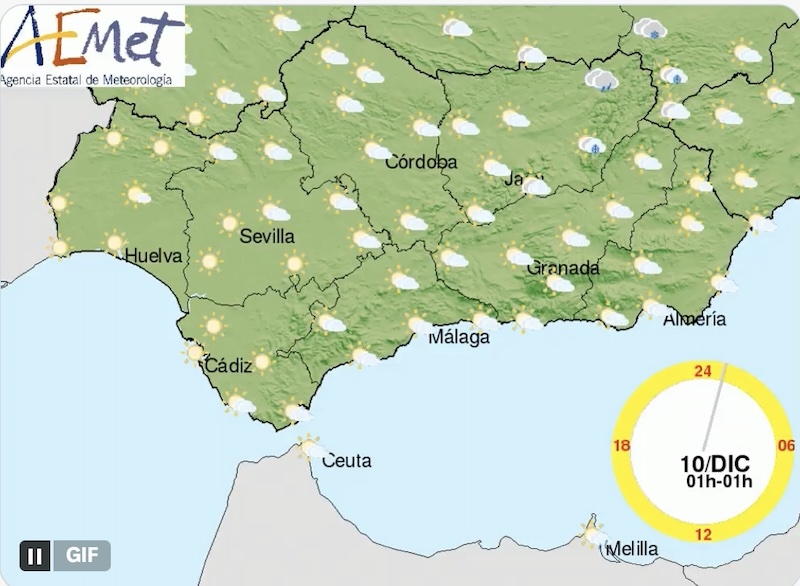 Den kallaste dagen i provinsen förväntas bli tisdagen den 10 december, med maximalt sju grader och lägst en minusgrad i Antequera. Kustområdena håller sig något varmare med 13–14 grader som högsta och sju grader som lägsta temperatur.