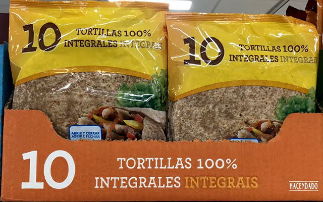 Mercadona har de senaste åren målmedvetet erbjudit allt fler fullkornsalternativ med harina integral. Det har de gjort mer eller mindre framgångsrikt. En del fullkornsalternativ, som deras hamburgerbröd, tycker jag inte är något vidare, men däremot rekommenderas deras tortillas integrales, som kommer i tiopack. De kan användas till mexikanska rätter som burritos och quesadillas, men även wraps av olika slag. Se till att värma bröden hastigt innan du fyller dem.
