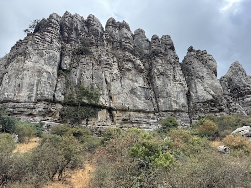 Himlen var dramatisk, stora moln i olika gråskalor, små blå fläckar här och var och ett underbart blomspruteregn som kom och gick. Vi började med att gå ut på den första indikerade utsiktsplatsen och redan där tappade vi lite grand andan av vyerna och känslan av att vara omgivna av dessa magiska miljoner år gamla klippformationer. Jag har genom åren sett många fotografier på El Torcal och många har rekommenderat platsen, men på bild är det bara platt och grått. Stenar.