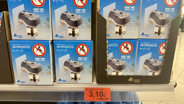 Antimosquitos. Ja, det finns mygg i Spanien, och de gillar mig. Jag är lite osäker på hur effektiva dessa bekämpningsapparater egentligen är, men jag inbillar mig att de fungerar, så de är ett måste i mitt hem från maj till oktober. 3,10 euro för Mercadonas egna Bosque Verde. När du väl köpt apparaten räcker det sedan att köpa påfyllningen (1,90 euro) som räcker ungefär en månad.