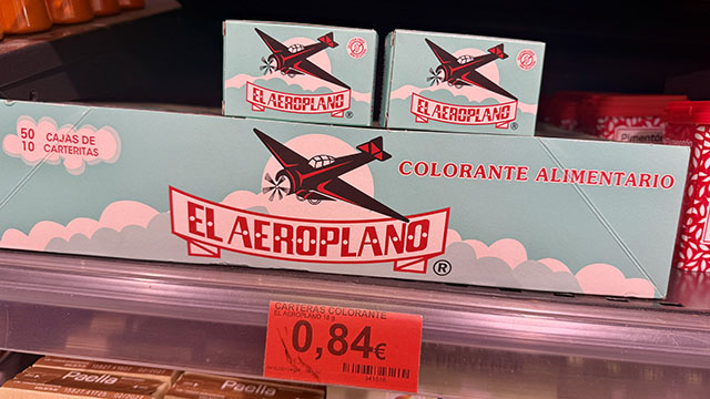 Det finns ett annat fynd på kryddhyllan. Det är inte bara paellan som behöver piffas upp med lite färgämne. Jag använder det även i till exempel fideuà och i vissa grytor, som min kaninstuvning med potatis. ”Flygplanet” är en gammal klassisk colorante, och en enda liten påse räcker mer än väl, både till en hel paella eller stora och små grytor. 0,84 euro för 10 påsar. Den ger ingen smak och går även att kombinera med saffran.
