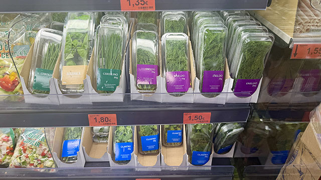 Färska örtkryddor uppskattas, särskilt när man slipper vänta till den lokala veckomarknaden för att fylla på. Mynta, dill, basilika, persilja, koriander och något vi nordbor särskilt gläds åt, gräslök (cebollino). Alltid fräscha och i bra förpackningar. En nackdel med Mercadona är att däremot att de använder sig av enorma mängder plast för sina produkter.