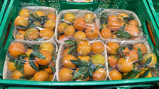 Under hösten och vintern finns det flera olika sorters mandariner och clementiner. Tveka inte att välja de som säljs i korg, framför att köpa i lösvikt. De i korg är nästan alltid godare. 3,90 euro för två kilo, och som allra godast och syrligast under december och januari. Och visst gillar man med Spanien att frukterna ofta presenteras och säljs med bladen kvar.