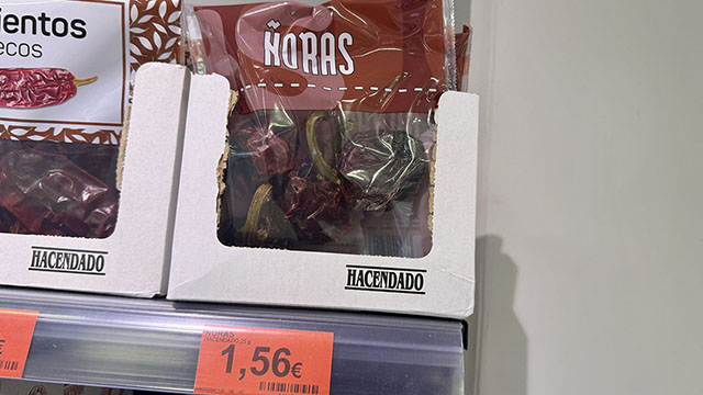 Från kryddhyllan väljer jag två produkter, båda typiskt spanska. Först Ñoras (soltorkad, rund röd paprika). Utmärkt till alla typer av tomatsåser, spanska sofritos och vissa grytor. *Jag brukar även lägga i några små bitar i olivoljan när jag tillagar min populära vitlökskyckling, Pollo al ajillo*. 1,56 euro. Obs! De har en god men intensiv, rökig smak som är betydligt kraftigare än man tror, så var försiktig med mängden. I min stora köttfärssås till tjocka släkten, till exempel, använder jag endast en liten ñora.