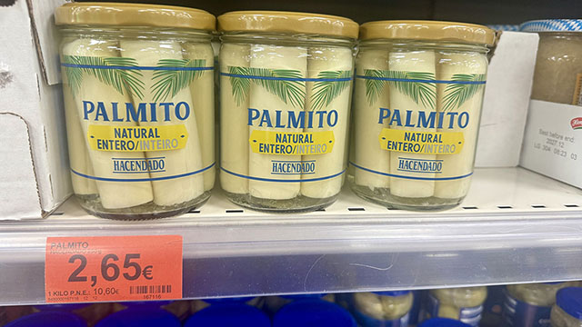 Palmhjärta Palmito. Bara namnet gör man blir sugen på att prova, eller hur? Och precis som det låter rör det sig om inlagda stammar från vissa palmträd. De är inte billiga och en nackdel är att det som eventuellt blir över håller sig knappt färska och goda två dagar efter. Däremot är det ett billigt sätt att förvandla exempelvis en tråkig isbergssallad till något lyxigt, och passar dessutom fantastiskt bra tillsammans med granatäpple. Smaken påminner lite om en annan grönsaksfavorit, hjärtat på kronärtskockan. 2,65 euro för en burk med sex stora bitar. Mycket svåra att hitta i Sverige och det första vår lillasyster i Stockholm ber oss ta med från Spanien. Det kan även heta palmmärg i Sverige.