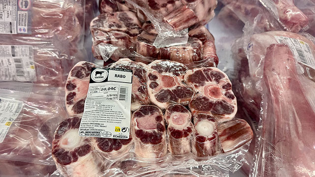 Jag går väldigt sällan förbi, eller ens stannar till vid frysboxarna. Men det finns ett undantag, som jag gör några gånger per år. Det är för att plocka den frysta oxsvansen rabo. Den håller mycket bra kvalitet och är huvudingrediens i en av hela min släkts absoluta favoriträtter (från vår mor Lenas recept). 17 euro kilot. Pluspoäng här även för att det är just oxsvans och inte tjursvans, vilket jag tycker gör sig bättre i långkokgrytan.