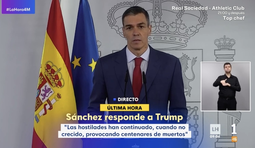 Framträdandet inträffade få timmar efter att USA:s president Donald Trump kritiserat Spaniens ovilja att upplåta de amerikanska baserna i Rota och Morón de la Frontera för angreppet mot Iran och hotat med ekonomiska sanktioner. Sánchez refererade inte konkret till hotet och fördömde Irans urskiljningslösa gensvar med attacker mot ett flertal olika länder, däribland EU-medlemmen Cypern.