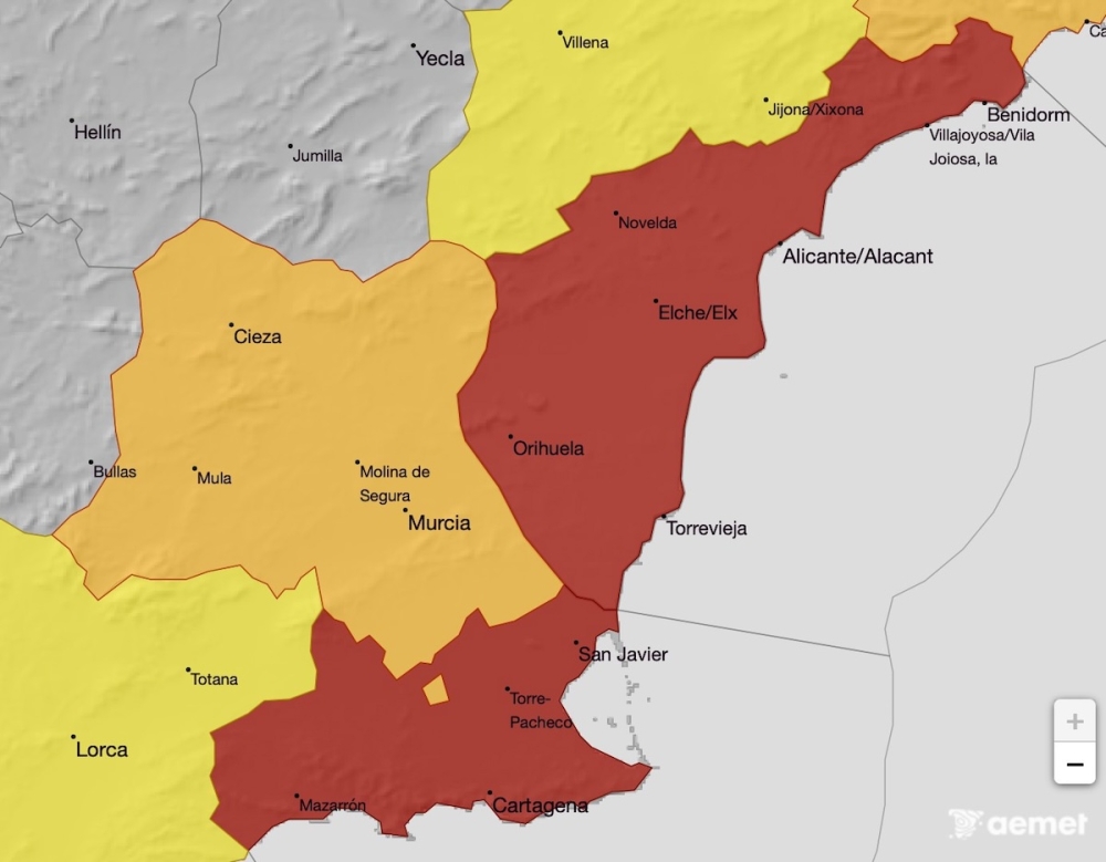 COSTA BLANCA Det spanska meteorologiska institutet AEMET har utfärdat maximal varning för regn och översvämningar i Alicanteprovinsen och Murcia. Undervisningen och andra evenemang ställs in i flera kommuner.