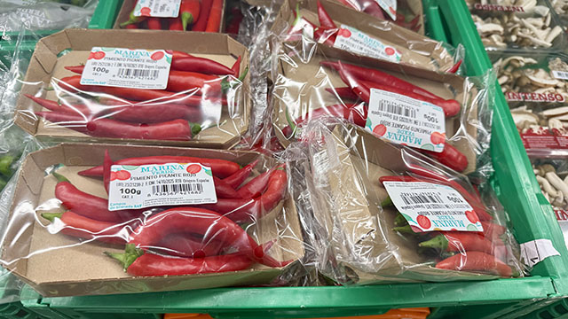 Färsk pikant chili Pimiento picante rojo hör inte till vanligheterna i spanska livsmedelsbutiker. Det är dock ett måste i mitt kök och den är användbar i många rätter, inte bara från Mexiko och Indien. Ett paket räcker lätt i över en månad, och jag är säker på att även stjärnkocken Jamie Oliver skulle plocka med sig den här från Mercadona, förutom koriandern då… 1,60 euro för ett paket (16 euro kilot)