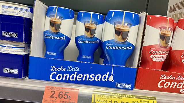 Jag har inte socker i mitt kaffe, men gillar att söta det med kondenserad mjölk. Storproducenten Nestlé har länge haft nästan monopol på denna produkt, men nu har deras variant fått konkurrens av Hacendados egen, minst lika bra och, förstås, billigare. Men det är fräckt när de till och med kopierar förpackningen. 2,65 euro. Finns både i konservburk och, enligt mig, ännu bättre i tub. Det finns även en lättvariant vars förpackning är röd.
