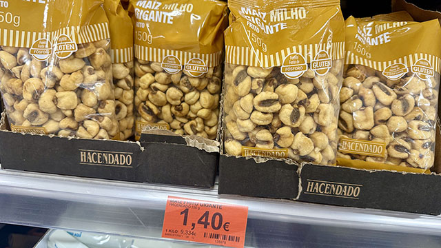 Den populära snacksen Maíz Frito Gigante (rostade och saltade majskorn) har jag ätit sedan jag var barn och växte upp i Spanien. Då var det de små av naturlig storlek. Den stora sorten gigante har jag ofta hemma. 1,40 euro. I Spanien kallas denna produkt för kikos, ett namn som alla spanjorer känner till. Mercadona har dock valt en tydligare beskrivning på förpackningen. Dessutom står all text på två språk, eftersom produkterna även säljs i Portugal. Egentligen är jag mer förtjust i de rostade solrosfröna pipas, men har inte hittat någon god sort på Mercadona. Minuspoäng där.