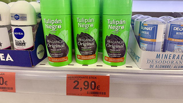 Här är en produkt som gör mig riktigt glad över Mercadona. Deodoranten Tulipán Negro är en spansk klassiker. På 80-talet doftade nästan alla spanjorer av den här ganska starka, syrliga men fräscha doften, och ja, alla minns också den välbekanta ”frätningen” i armhålan… Numera är den tyvärr svår att hitta i butikerna, så stort pluspoäng till Mercadona för att de har den i sitt sortiment. Dessutom är den mycket billig, 2,90 euro och räcker flera månader. Det fanns tidigare en duschkräm av samma märke också, men den verkar ha försvunnit från marknaden. Synd.